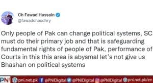 اسلام آباد (پی این آئی) اطلاعات ونشریات کے سابق وفاقی وزیر اورپی ٹی آئی رہنما فواد چوہدری کی سپریم کورٹ کے خلاف شدید قسم کی بدزبانی سامنے آئی ہے۔ٹوئٹر پر جاری اپنےبیان میں فواد چوہدری نےسپریم کورٹ کے خلاف ہرزہ سرائی کرتے ہوئے کہا کہ سپریم کورٹ اپنے بنیادی کام سے کام رکھے، اس کا کام بنیادی حقوق کا تحفظ ہے، عدالتوں کی بنیادی حقوق پر کارکردگی شرمناک ہے۔ انہوں نے کہا کہ عدالتیں اپنی کارکردگی کو بہتر بنائیں اور ہمیں سیاسی نظام پر بھاشن دینا بند کریں،