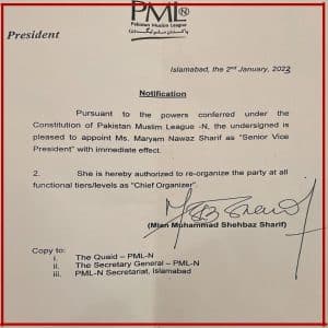 اسلام آباد (پی این آئی) وفاقی وزیر اطلاعات مریم اورنگزیب نے ٹویٹر پیغام میں اعلان کیا ہے کہ پاکستان مسلم لیگ (ن) کے صدر شہباز شریف نے پارٹی کے بڑے تنظیمی فیصلے کا اعلان کر دیا، مریم اورنگزیب کے مطابق شہباز شریف نے مریم نواز شریف کو پاکستان مسلم لیگ (ن) کی سینئر نائب صدر مقرر کر دیا ہے۔۔۔۔