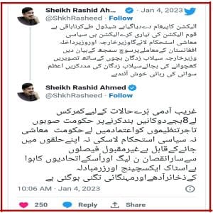 شیخ رشید نے یہ بھی کہا کہ 8 بجے دوکانیں بند کرنے کے معاملے پر حکومت کو چاہیے کہ صوبوں اور تاجر تنظیموں کو اعتماد میں لے۔۔۔۔۔