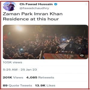 لاہور (پی این آئی) پی ٹی آئی کے سینئر رہنما فواد چوہدری کے ٹوئٹر اکاؤنٹ سے صبح 5 بجکر 25 منٹ پر ٹوئٹر پر زمان پارک کے باہر کی ویڈیو پوسٹ کی۔ ٹویٹر پر فواد چوہدری نے ویڈیو کے ساتھ پیغام میں لکھا کہ عمران خان کی رہائش گاہ کے باہر اس وقت یہ ماحول ہے۔۔۔۔۔