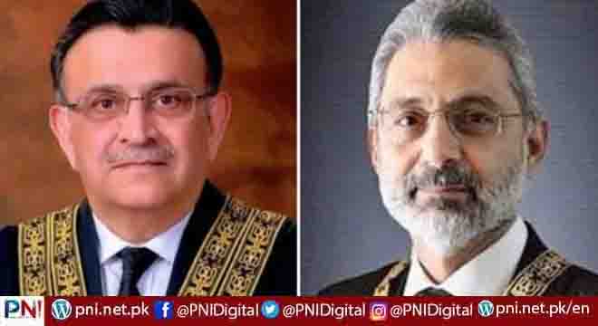 چیف جسٹس آف پاکستان جسٹس عمر عطا بندیال اور جسٹس قاضی فائز عیسیٰ کے درمیان اہم ملاقات ہوئی ہے، افطار سے کچھ دیر قبل ملاقات خوشگوار ماحول میں جاری رہی۔جسٹس قاضی فائز عیسیٰ کا وضاحتی بیان چیف جسٹس کی مشاورت سے جاری ہوا، دونوں جج صاحبان نے اہم امور پر تفصیلی بات چیت کی۔ یاد رہے سپریم کورٹ کے جسٹس قاضی فائز عیسیٰ نے آئین گولڈن جوبلی کنونشن میں شرکت پر وضاحت جاری کی ہے، جسٹس قاضی فائز عیسیٰ نے کہا کہ آئین سے اظہار یکجہتی کیلئے کنونشن میں شرکت کی دعوت قبول کی، یقین دہانی حاصل کی گئی تھی کہ سیاسی تقاریر نہیں ہوں گی، تقریر نہیں کرنی تھی لیکن سیاسی بیانات پربات کرنے کی درخواست کی، آئین کی گولڈن جوبلی تمام شہریوں کیلئے باعث مسرت ہے، یہ کسی مخصوص ادارے یا سیاسی جماعت کا تنہا استحقاق نہیں ہے۔