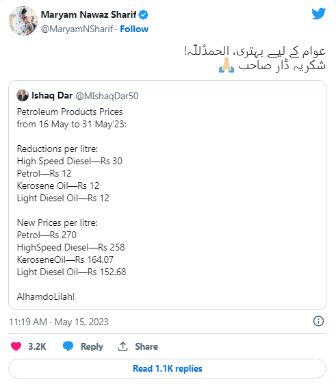 حکومت کی جانب سے پیٹرولیم مصنوعات کی قیمتوں میں کمی پر ن لیگ کی سینیئر نائب صدر مریم نواز کا ردعمل سامنے آیا ہے۔اپنی ٹوئٹ میں مریم نواز نے کہا کہ ’عوام کیلئے بہتری، الحمدللہ۔ شکریہ ڈار صاحب۔‘