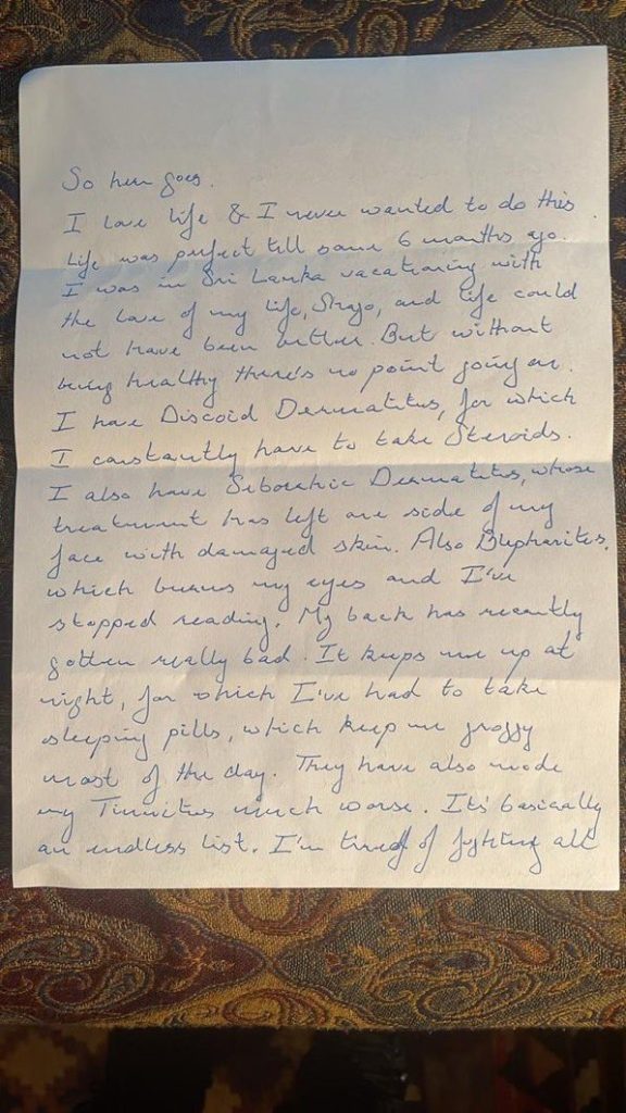 لاہور (پی این آئی) استحکام پاکستان پارٹی کے سربراہ، پیڑن اِن چیف جہانگیرترین کے بھائی عالمگیرترین کی لاش کے قریب سے ملنے والی تحریر سامنے آگئی۔ جس میں لکھا کہ جِلدی بیماری کی وجہ سے مستقل اسٹیرائیڈز لینا پڑتی ہیں، ڈاکٹروں کے چکر نہیں لگانا چاہتا۔