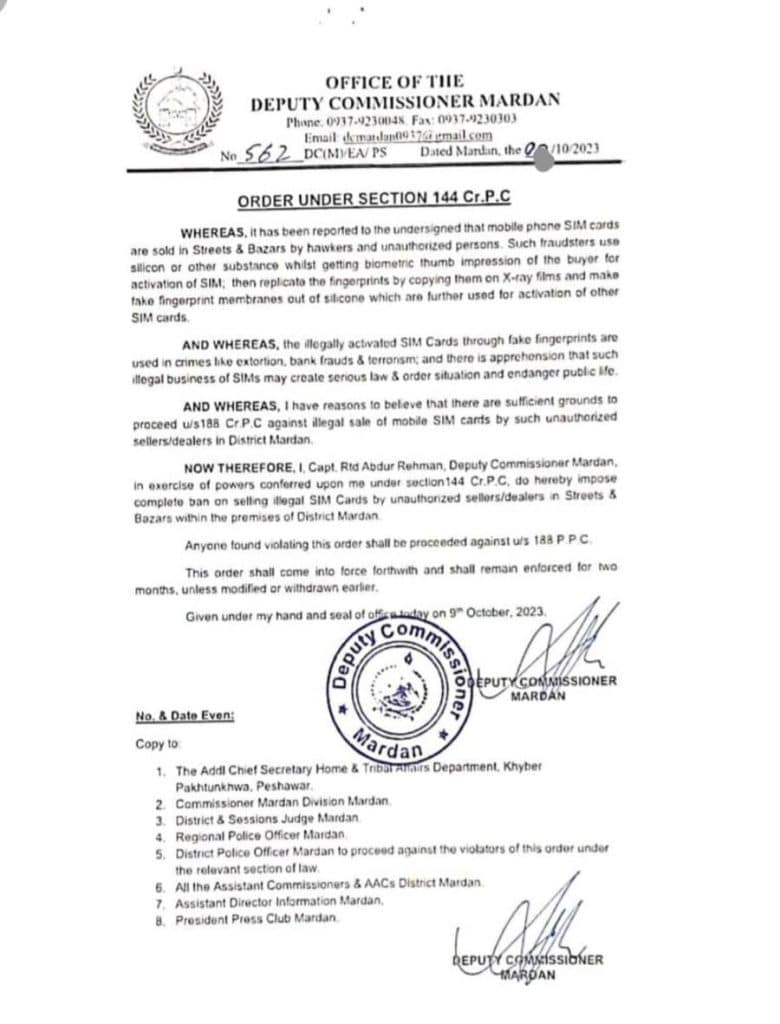 ڈپٹی کمشنر مردان نے دفعہ 144 کے تحت موبائل فون کی سم کمپنیوں کے دفاتر کے سوا کسی بھی دوکان پر فروخت کرنے پر مکمل پابندی کا اعلامیہ جاری کر دیا۔ڈپٹی کمشنر مردان کے مطابق موبائل سم کی فروخت پر یہ پابندی معصوم شہریوں کو کسی بھی نا خوش گوار واقع سے بچنے کیلئے لگائی گئی ہے۔غیر قانونی سمز دہشت گردی اور دیگر کاموں کیلئے استعمال ہوتی ہی۔ شہر میں بغیر کسی کاغذی کاروائی اور ویری فیکیشن کے سم فروخت ہورہی ہیں۔ ڈپٹی کمشنر کے دفتر کی جانب سے واضح کیا گیا ہے کہ اب کسی بھی دوکاندار نے موبائل فون کی سم فروخت کی تو اسے فوری طور پر گرفتار کر کے جیل بھیجا جائے گا۔ قانونی اجازت نامہ کے بغیر سم فروخت پر پابندی عائد کی جارہی ہے. سموں کی غیر قانونی فروخت پر پابندی دو ماہ کیلئے لگائی گئی .خلاف ورزی پر قانون کے مطابق کارروائی کی جائے گی۔