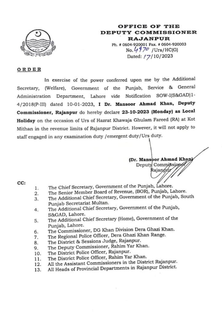 جام پور کے ڈپٹی کمشنر راجن پور ڈاکٹرمنصوربلوچ نے 23 اکتوبرمقامی چھٹی کا اعلان کردیا۔ چھٹی کا نوٹیفکیشن بھی جاری کردیا گیا۔ واضح رہے کہ چھٹی کا اطلاق امتحانی ڈیوٹی ایمرجنسی اور عرس ڈیوٹی کے عملے پر نہیں ہوگا۔