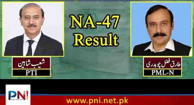 این اے 47 (NA47) اسلام آباد سے غیر حتمی غیر سرکاری نتائج کے مطابق پی ٹی آئی کے حمایت یافتہ امیدوارشعیب شاہین 4768ووٹ لے کر آگے ہیں، پاکستان مسلم لیگ ن کے طارق فضل چودھری 2136ووٹ لے کر دوسرے نمبر پر ہیں۔خیال رہے کہ پاکستان میں عام انتخابات کے لیے ووٹنگ صبح 8 سے شام 5 بجے تک جاری رہا، ملک بھر میں 16 ہزار 766 پولنگ اسٹیشن انتہائی حساس قرار دیے گئے، حساس ترین پولنگ اسٹیشنوں کے باہر فوج تعینات کی گئی۔ ملک بھر میں 16 ہزار 766 پولنگ اسٹیشن انتہائی حساس قرار دیے گئے، حساس ترین پولنگ اسٹیشنوں کے باہر فوج تعینات کی گئی۔