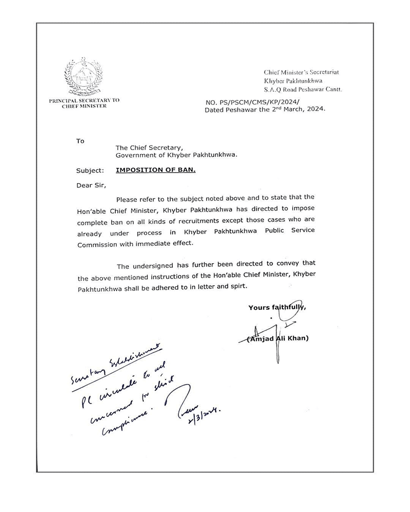 وزیراعلیٰ سیکریٹریٹ کی جانب سے چیف سیکریٹری خیبرپختونخواکو جاری کیے گئے مراسلے میں کہا گیا کہ وزیراعلی علی امین گنڈاپورنےسرکاری بھرتیوں پرپابندی عائدکردی ہے۔ KPK مراسلہ کے مطابق پبلک سروس کمیشن کےتحت بھرتیوں پر پابندی نہیں ہوگی،اس کے علاوہ وزیراعلیٰ کے پی کے نے گزشتہ1سال میں ہونیوالی تمام بھرتیوں کارکارڈبھی طلب کرلیا۔