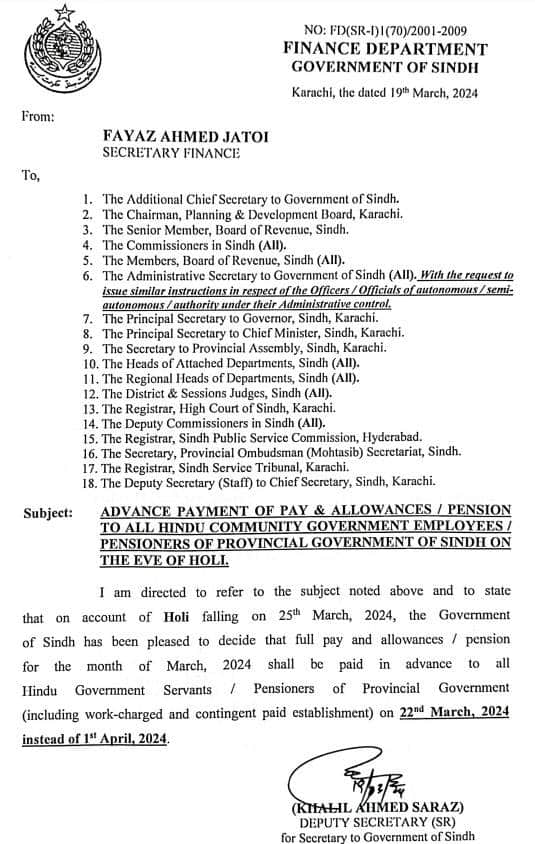 سندھ حکومت کی جانب سے فیصؒلہ کیا گیا ہے کہ ہندو برادری کے تہوارہولی پر ملازمین کو تنخواہ اور پینشن ایڈوانس ادا کی جائے گی ،رواں ماہ کی تنخواہ یکم اپریل کے بجائے 22 مارچ کو ہند وسرکاری ملازمین کو دے دی جائے گی۔ محکمہ خزانہ سندھ نے نوٹیفکیشن بھی جاری کردیا۔