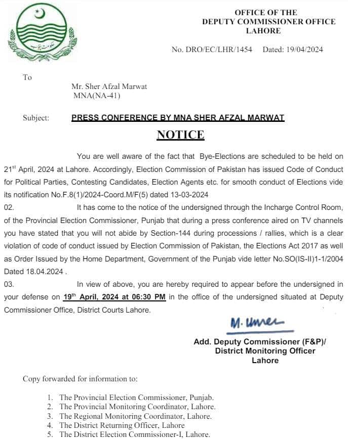 ڈی ایم او نے شیر افضل مروت کو آج شام ساڑے چھ بجے دفتر طلب کر لیا ۔ نوٹس کے مطابق شیر افضل مروت نے بیان تھا کہ وہ کسی دفعہ 144 کو نہیں مانیں گے جو کہ محکمہ داخلہ پنجاب نے نفاز کیا ہوا ہے۔ ڈسٹرکٹ ریٹرنگ آفیسر عمر مقبول کا کہنا ہے کہ شیر افضل مروت کو وضاحت کے لئے طلب کیا گیا ہے۔