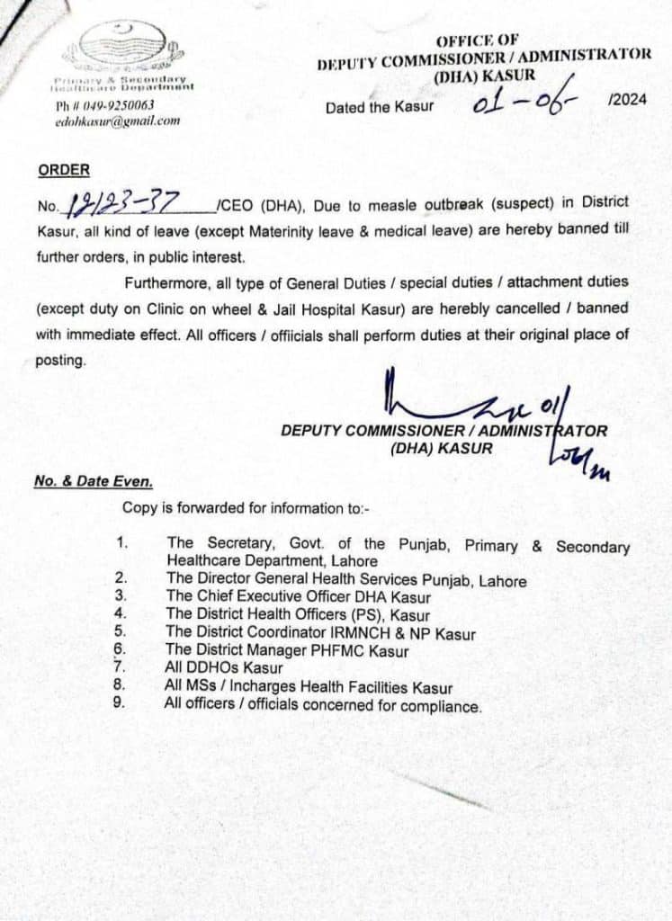 سی ای او ہیلتھ ڈاکٹر طلحہ نے تاحکم ثانی ضلع قصور میں محکمہ صحت کے ملازمین کی چھٹیاں منسوخ کردیں، چھٹیاں ممکنہ خسرے کی وباء پھیلنے کی وجہ سے منسوخ کی گئیں، ملازمین کی عارضی ڈیوٹیاں بھی ختم کردی گئیں، تعیناتی کی جگہ پر ڈیوٹی سر انجام دینے کا نوٹیفکیشن جاری کر دیا گیا۔