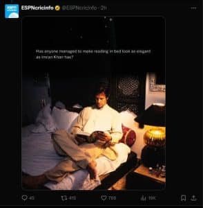 خاص طور پر پاکستانی نوجوان ان کی ہر ادا کے فین ہیں لیکن صرف پاکستان ہی نہیں بلکہ بیرون ملک میں لاکھوں لوگ اور ادارے ان کے سحر میں مبتلا ہیں۔تفصیلات کے مطابق سماجی رابطوں کی ویب سائٹ ایکس پر ایک تصویر وائرل ہورہی ہے۔ جس میں عمران خان کو ایک بستر پر بیٹھے کتاب پڑھتے دکھایا گیا ہے۔ کہنے کو تو یہ ایک تصویر ہے لیکن اگر ایکس یوزر کی بات کی جائے تو یہ تصویر ESPNcricinfo کی جانب سے شیئر کی گئی ہے۔ اس تصویر میں عمران خان کو انتہائی پرکشش شخصیت سے تعبیر کیا گیا ہے اور اس تصویر کے عنوان نے بتادیا ہے کہ سابق وزیراعظم کے چاہنے والے دنیا بھر میں موجود ہیں۔ جن کے دل عمران خان کے ساتھ دھڑکتے ہیں۔ تصویر کے عنوان میں لکھا گیا ہے کہ کیا کوئی اور بھی کتاب پڑھتے ہوئے عمران خان جیسا خوبصورت لگ سکتا ہے؟