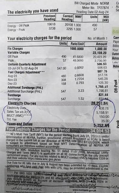 واضح رہے کہ کے ایم سی کے ذمے کے الیکٹرک کے ڈیڑھ ارب واجبات ہیں۔ میئر کراچی کا کہنا ہے کہ بجلی بل کے ذریعے ٹیکس وصولی شہر کے مفاد میں ہے،101 سے 200 یونٹ تک استعمال کرنے پر 20 روپے، 201 سے 300 تک یونٹ استعمال کرنے پر 40 روپے کے ایم سی ٹیکس عائد کیا گیا ہے۔ اسی طرح 301 سے 400 یونٹ تک 100 روپے، 401 سے 500 یونٹ تک 125 روپے ٹیکس شامل کیا گیا ہے،501 سے 600 یونٹ تک 150 روپے، 601 سے 700 یونٹ تک 175 روپے، 700 سے زائد یونٹ استعمال کرنے والے صارفین پر 300 روپے یوٹیلیٹی کی مد میں واجب الادا ہوں گے۔ کمرشل بجلی استعمال کرنے والے صارفین کی تمام کیٹیگریز پر 400 روپے لاگو کیے گئے ہیں، صنعتی صارفین کی تمام کیٹیگریز پر بھی 400 روپے لاگو کیے گئے ہیں۔