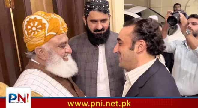گزشتہ 48 گھنٹے میں بلاول بھٹو زرداری کی دوسری بار مولانا فضل الرحمان کے گھر آمد ہوئی۔مولانا فضل الرحمان نے بلاول بھٹو زرداری کا وفد کے ہمراہ استقبال کیا ۔بلاول بھٹو زرداری کے ساتھ وفد میں خورشید شاہ ، نوید قمر، مرتضیٰ وہاب اور جمیل سومرو بھی شامل تھے۔