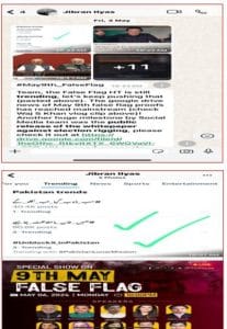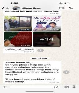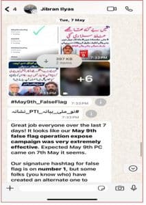 ذرائع کے مطابق رواں سال یکم مئی کو جبران الیاس نے رؤف حسن کو ٹی وی چینلز کے اسکرین شاٹس بھیجے جس میں جسٹس اطہر من اللہ اور جسٹس قاضی فائز عیسیٰ کے 9 مئی کے حوالے سے ریمارکس بھی شیئر کیے گئے ، ، جبران الیاس نے رؤف حسن کو سوشل میڈیا پر چلائے گئے ٹرینڈز “مداخلت ہوتی ہے” اور “مئی 9 فالس فلیگ” بھی شئیر کیا، جبران الیاس کی جانب سے جسٹس منصور علی شاہ کا بیان بھی پروپیگنڈے کے لئے شیئر کیا گیا جس میں کہا گیا تھا کہ”یہ کس قسم کی ریاست ہے کہ ہر وقت اس چیز کا ڈر لگا رہتا ہے کہ کوئی ہمیں دیکھ رہا ہے، کوئی ہمیں سن رہا ہے، کوئی ہماری ریکارڈنگ کر رہا ہے، کیمرے ہماری ویڈیو بنا رہے ہیں، کیا ریاست اس طرح چلائی جاتی ہے”؟ ۔