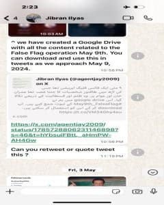 تفصیلات کے مطابق غیر ملکی ایجنڈے پر کار بند جبران الیاس بیرونِ ملک سے پی ٹی آئی کا ریاست مخالف بیانیہ چلا رہا ہے، رؤف حسن کے ساتھ واٹس ایپ پیغامات نے سازش کا پول کھول دیا ہے ، سانحہ 9مئی کے ایک سال مکمل ہونے کے موقع پر پروپیگنڈہ پھیلانے کےلئے جبران الیاس نے رؤف حسن کو واٹس ایپ پر ہدایات دیں، دسمبر 2023سے مئی 2024 تک تصاویر، ویڈیوز اور پیغامات کے ذریعے مختلف بیانیے جبران الیاس نے رؤف حسن کو بھیجے ، جبران الیاس نے رؤف حسن کو پروپیگنڈے کے لئے 9 مئی سے متعلقہ فتنہ پھیلانے والی ویڈیوز اور ہیش ٹیگز بھی ارسال کئے۔