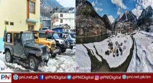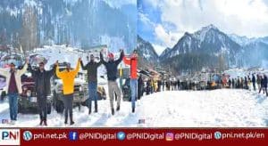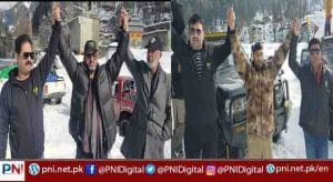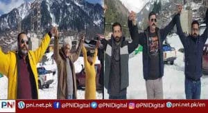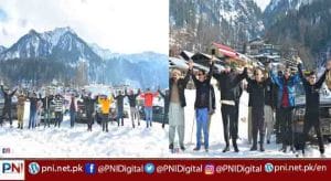 مظفرآباد جیپ کلب کے زیر اہتمام منعقدہ یکجہتی کشمیر سنوکراس جیپ ریلی کے شرکاء اور سیاحوں نے وادی نیلم کے تاریخ اور خوبصورت سیاحتی مقام شاردہ میں کئی فٹ برف پر کھڑے ہوکر مقبوضہ کشمیر میں بھارتی ظلم وستم کا شکار کشمیریوں سے یکجہتی کیلئے ہاتھوں کی علامتی زنجیر بناکر انوکھا انداز اپنایا ۔