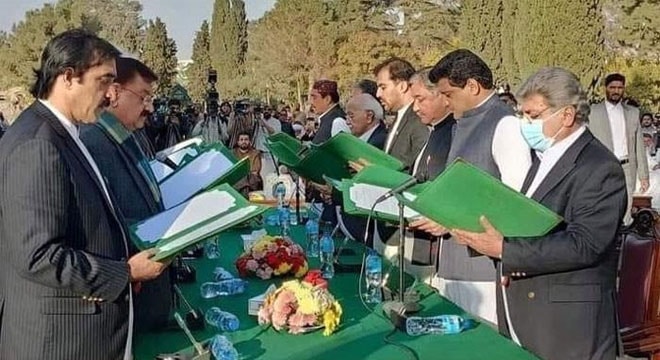 جس کے دوران گورنر بلوچستان سید ظہور آغا نے نومنتخب وزراء بلوچستان عوامی پارٹی کے میر ظہور احمد بلیدی، سردار صالح بھوتانی،حاجی نور محمد دمڑ، سردار عبد الرحمان کھیتران،حاجی اکبر آسکانی، میر سکندر علی عمرانی، حاجی محمد خان لہڑی، نوابزادہ طارق مگسی، بلوچستان نیشنل پارٹی عوامی کے میر اسد اللہ بلوچ، سید احسان شاہ، پاکستان تحریک انصاف کے نصیب اللہ مری، مبین خان خلجی،عوامی نیشنل پارٹی کے انجینئر زمرک خان اچکزئی،ہزارہ ڈیموکریٹک پارٹی کے عبدالخالق ہزارہ ودیگر سے حلف لیا۔ اس موقع پر اراکین صوبائی اسمبلی، سیاسی جماعتوں کے رہنماؤں، بیوروکریٹس، قبائلی عمائدین سمیت زندگی کے مختلف شعبہ ہائے زندگی سے تعلق رکھنے والے افراد بڑی تعداد میں موجود تھے۔۔۔۔