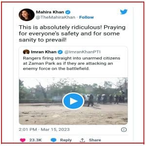 لاہور (پی این آئی) زمان پارک میں پولیس آپریشن کے حوالے سے خوبرو اداکارہ ماہرہ خان بھی خاموش نہ رہ سکیں۔۔۔۔ ماہرہ خان نے لاہور کی سیاسی اور امن و امان کی صورتحال پر اپنا ردعمل ظاہر کر دیا۔۔۔۔گزشتہ روز عمران خان نے اپنی رہائش گاہ کے باہر کے مناظر سوشل میڈیا اکاؤنٹ پر شیئر کیے جو ماہرہ خان نے بھی دیکھے۔۔۔۔عمران خان کی جانب سے ویڈیو پوسٹ کرنے کے کچھ دیر بعد ماہرہ خان نے اس پر اپنا ردعمل دیا۔۔۔۔