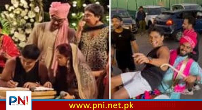 اداکار عامر خان کی بیٹی ایرا خان کی اپنے منگیتر نوپور شیکھرے سے شادی ہوگئی۔ عامر خان کے داماد نے اپنے خاص دن کے لیے ایسا حلیہ اپنایا کہ سب دھنگ رہ گئے، انہوں نے نکاح کی تقریب کے دوران صرف ایک سیاہ بنیان اور سفید شارٹس پہنی جو کہ حیران کن چیز تھی۔