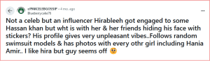 جبکہ حسن علی کے انسٹاگرام اکاؤنٹ پر نظر ڈالی جائے تو کئی لڑکیوں کے علاوہ اداکارہ ہانیہ عامر کا حسن علی فالو کو کرنا اور انکے ساتھ تصاویر بنوانا ماضی کی کہانی کی جانب اشارہ دیتا معلوم ہورہا تھا۔ریڈٹ پر موجود ایک صارف نے یہ دعویٰ کیا ہے کہ ’ہانیہ عامر اور حسن علی اس وقت سے تعلقات میں ہیں جب ہانیہ عامر انڈسٹری سے کوسوں دور تھیں لیکن ڈراما سیریل ’پرواز ہے جنون‘ میں اداکاری کے بعد وقت نے ایسا پلٹا کھایا یہ ان دونوں نے محض دوستی کے علاوہ اپنے تمام تر تعلقات کو الوداع کہہ دیا۔