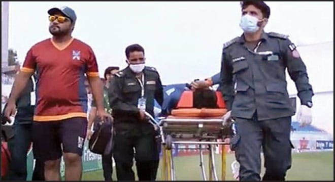 ہاتھ کے بلے باز کو سٹریچر پر لے جایا گیا جب ٹیم کے فزیوتھیراپسٹ نے ابتدائی طور پر اس کا علاج کیا۔۔۔۔