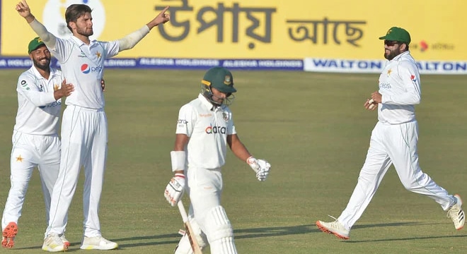 اور بنگلا دیش کو فالو آن کا شکار کرنے میں اہم کر دار ادا کیا۔بنگلا دیش کی جانب سے شکیب الحسن 33 رنز بنا کر نمایاں بلے باز رہے جبکہ نجم الحسن شنٹو نے 30 رنز بنائے، میزبان ٹیم کے 9 بلے باز ڈبل فیگر میں بھی داخل نہ ہو سکے جبکہ ساجد خان نے 42 رنز دیکر 8 کھلاڑیوں کو آؤٹ کیا، ایک وکٹ شاہین شاہ آفریدی کے حصے میں آئی اور ایک بنگلا دیشی بلے باز رن آؤٹ ہوا۔کھیل کے چوتھے روز پاکستان نے اپنی پہلی اننگز 300 رنز 4 کھلاڑی آؤٹ پر ڈکلیئر کر دی تھی۔ پاکستان کی جانب سے بابر اعظم، اظہر علی، فواد عالم اور محمد رضوان نے نصف سنچریاں اسکور کی تھیں۔