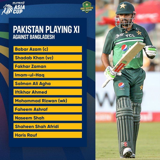 باقی کھلاڑیوں میں اوپنر امام الحق، فخر زمان، بابر اعظم، افتخار احمد، محمد رضوان، سلمان علی آغا، شاداب خان، فہیم اشرف، حارث رؤف، شاہین آفریدی اور نسیم شاہ شامل ہیں۔پاکستان اور بنگلہ دیش کے درمیان ایشیا ءکپ سپر فورکا پہلا میچ کل قذافی سٹیڈیم لاہور میں کھیلا جائے گا۔ایشیاء کپ کے پہلےمرحلے میں پاکستان نے افتتاحی میچ میں نیپال کو شکست دی تھی جبکہ بھارت کے خلاف دوسرا میچ بارش کی نذر ہوگیا تھا۔واضح رہے کہ ایشیاء کپ 31 اگست سے 17 ستمبر تک کھیلا جائےگا، ایونٹ کے 9 میچز سری لنکا اور 4 میچز پاکستان میں ہوں گے۔سپر 4 پلے آف کے میچز 6 سے 15 ستمبر تک ہوں گے جبکہ 17 ستمبر کو ٹورنامنٹ کا فائنل کولمبو میں کھیلا جائےگا۔