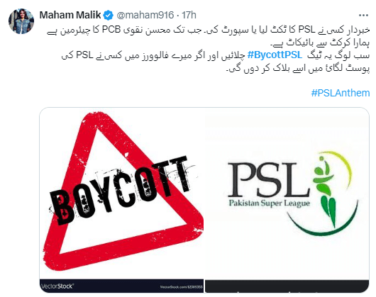سعودی ویب سائٹ اردو نیوز کے مطابق بدھ کے روز پی ایس ایل کے لیے آفیشل اینتھم ریلیز ہونے کے بعد سوشل میڈیا پر جہاں مختلف تبصرے اور ٹرینڈز زور پکڑ رہے ہیں وہیں بہت سے صارفین اس ٹورنامنٹ کے بائیکاٹ کی پوسٹس بھی کر رہے ہیں۔ مائیکرو بلاگنگ ویب سائٹ ایکس (سابق ٹوئٹر) پر بائیکاٹ پی ایس ایل کے ہیش ٹیگ سے متعلق پوسٹس کا جائزہ لیا جائے تو ان میں ایک ہی عنوان نظر آ رہا ہے جس میں لکھا گیا ہے کہ ’خبردار کسی نے پی ایس ایل کا ٹکٹ لیا یا سپورٹ کی۔ جب تک محسن نقوی پی سی بی کے چیئرمین ہیں ہمارا کرکٹ سے بائیکاٹ ہے۔‘ وائرل ہونے والی اس پوسٹ میں ماہم ملک نامی صارف نے مزید لکھا ’سب لوگ بائیکاٹ کا ٹرینڈ چلائیں اور اگر میرے فالوورز میں کسی نے پی ایس ایل کی پوسٹ لگائی میں اسے بلاک کر دوں گی۔
