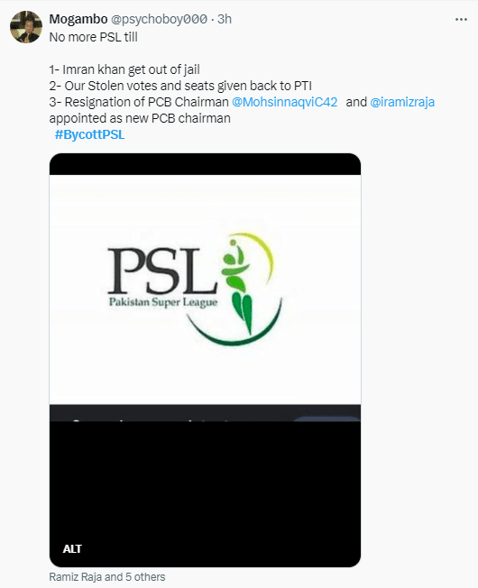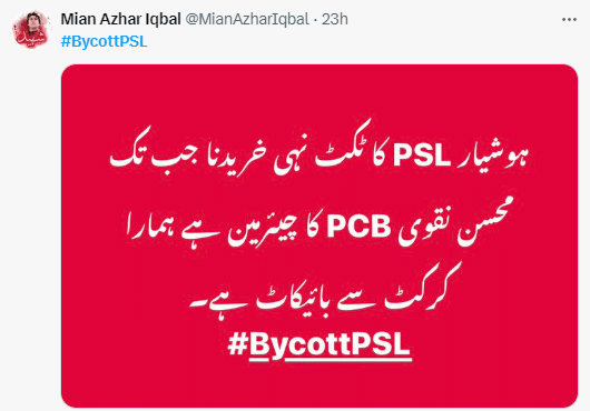 ‘ اظہر اقبال نامی صارف نے اس ہی ٹرینڈ کا فالو کرتے ہوئے اپنی پوسٹ میں لکھا ’پی ایس ایل کا ٹکٹ نہیں خریدنا، جب تک محسن نقوی پی سی بی کے چیئرمین ہیں ہمارا پی ایس ایل سے بائیکاٹ ہے۔‘ ایک اور صارف نے اپنی پوسٹ میں شرائط کی فہرست جاری کرتے ہوئے لکھا کہ پی ایس ایل کا تب تک بائیکاٹ ہے جب تک عمران خان جیل سے رہا نہیں ہوتے، پی ٹی آئی کو مینڈیٹ واپس نہیں ملتا، محسن نقوی استعفیٰ نہیں دیتے اور رمیز راجہ کو پی سی بی چیئرمین نہیں لگایا جاتا۔‘ ایان نامی اکاؤنٹ نے پوسٹ میں کہا ’یہ ایک چال ہے، پی ایس ایل کی ٹکٹس نہ خریدیں، یہ سب ہمارا دھیان الیکشن سے ہٹانے کیلئے کیا جا رہا ہے۔‘ واضح رہے بائیکاٹ کا یہ ٹرینڈ اور سوشل میڈیا پر وائرل ہونے والی متعدد پوسٹس صارفین کی اپنے ذاتی آرا کی عکاسی کرتے ہیں۔ بظاہر سیاسی دکھنے والے اس ٹرینڈ کے حوالے سے براہ راست کسی سیاسی جماعت نے کوئی موقف نہیں دیا۔
