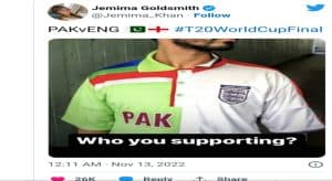 اس تصویر میں نظر آنے والی نصف جرسی پاکستان اور آدھی انگلینڈ کی نمائندگی کر رہی ہے۔ عمران خان کی سابقہ اہلیہ جمائما گولڈ اسمتھ نے یہ تصویر شیئر کرتے ہوئے سوال پوچھا ہے کہ آپ کونسی ٹیم کو سپورٹ کر رہے ہیں؟ جمائما کی اس ٹوئٹ پر زیادہ ترصارفین کا اپنے ردِ عمل میں کہنا ہےکہ وہ پاکستان کو سپورٹ کریں گے۔…