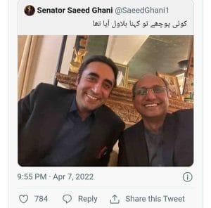 ٹویٹر پر سیلفی کے ساتھ ہی سعید غنی نے لکھا کہ “کوئی پوچھے تو کہنا بلاول آیا تھا”۔ ایک اور ٹوئٹ میں سعید غنی نے کہا کہ ’آئین کی جیت کا جشن منا رہے ہیں۔ یہ بات اہم ہے کہ گزشتہ روز قومی اسمبلی میں تحریک عدم اعتماد مسترد ہونے کے بعد سپریم کورٹ کی جانب سے لیے گئے ازخود نوٹس کا فیصلہ سنادیا گیا۔ فیصلے میں ڈپٹی اسپیکر کی رولنگ کو کالعدم قرار دیتے ہوئے عدالت عظمیٰ نے تحلیل کی گئی اسمبلی کو بحال کردیا گیا۔