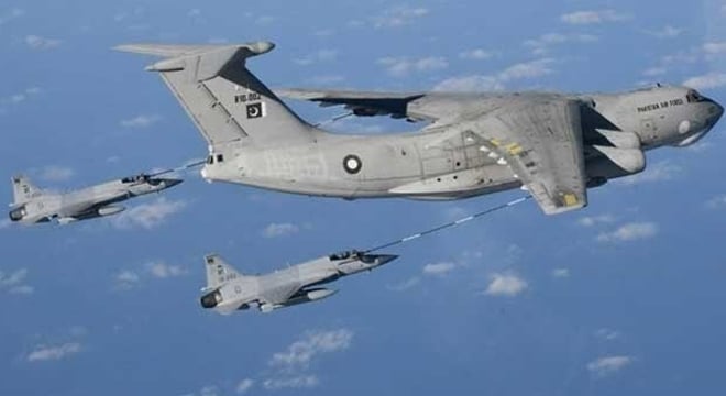 کراچی (پی این آئی)پاک فضائیہ کی طرف سے بحرین انٹرنیشنل ایئر شو میں جے ایف-17 تھنڈر طیارے کی تعیناتی کے دوران فضا میں ایندھن بھرنے کا مظاہرہ کیا گیا۔نجی ٹی وی ایکسپریس کے مطابق ترجمان پاک فضائیہ کے مطابق پاک فضائیہ نے اپنے تین جے ایف-17 لڑاکا طیارے بحرین انٹرنیشنل ایئر شو میں اپنے آئی ایل-78 ٹینکر طیارے کی معاونت سے تعینات کیئے۔پاک فضائیہ کی ایک آپریشنل ایئر بیس سے