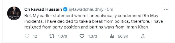 اس سے قبل تحریک انصاف خیبرپختونخوا کی رہنما نادیہ شیر نے پارٹی چھوڑنے کا اعلان کیا تھا ۔ پشاور میں پریس کانفرنس کرتے ہوئے نادیہ شیر کاکہنا تھا کہ 9 مئی کو جو کچھ ہوا اس پر افسوس ہے ، قومی املاک اور شہداء کی یادگاروں کو نقصان پہنچانے کی جتنی مذمت کی جائے کم ہے۔ انہو ں نے کہا کہ جیلوں میں قید تحریک انصاف کے کارکنوں کو پیغام دینا چاہتے ہوں کہ عمران خان نے آپ سے لاتعلقی کا اظہار کردیا ہے، عمران خان کو صرف اور صرف اپنی فکر ہے۔ انہوں نے کہا کہ 9 مئی کے واقعات کے بعد اس جتھے کا حصہ نہیں رہ سکتی۔