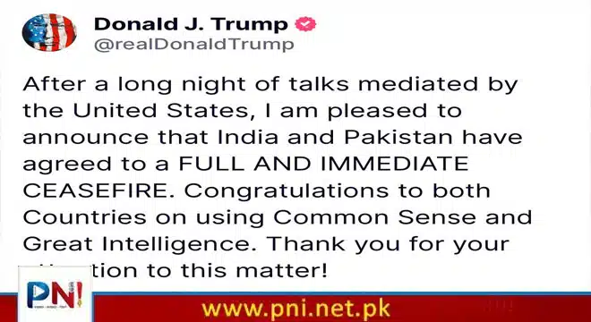 اس سے قبل امریکی صدر ڈونلڈ ٹرمپ کا کہنا تھا کہ بھارت اور پاکستان سیز فائر پر تیار ہوگئے ہیں۔ دونوں نے ہوش مندی اور دانشمندی کا مظاہرہ کیا۔سماجی رابطے کی ویب سائٹ ایکس پر جاری اپنے بیان میں ڈونلڈ ٹرمپ کا کہنا تھا کہ امریکا کی ثالثی میں بھارت اور پاکستان فوری جنگ بندی پر متفق ہوگئے ہیں۔ڈونلڈ ٹرمپ نے کہا کہ بھارت اور پاکستان نے مکمل اور فوری جنگ بندی پر رضا مندی ظاہر کر دی، پاکستان اور بھارت نے ہوش مندی اور دانشمندی کا مظاہرہ کیا۔امریکی وزیرخارجہ کا اس حوالے سے کہنا ہے کہ پاکستان اوربھارت وسیع تر مسائل پر کسی غیرجانبدار مقام پر مذاکرات کریں گے۔
