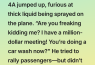 “Are you freaking kidding me?” he roared. “We’re already late and you’re doing a car wash? I have a million-dollar meeting! This is a joke!” He actually started rallying the other passengers, trying to start a riot over us “cleaning the windows” while he was in a hurry.