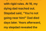 After weeks of fighting, Tom finally drove me to the hospital. Dad could barely speak. He squeezed my hand once. That was it. He died two days later.