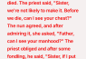 The nun, taken aback yet fully aware of the seriousness of the situation, nodded in agreement. The priest looked on with admiration, and after a moment of hesitation, the nun, always the daring one, inquired, “Father, may I see your manhood?”