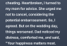 By the fifth night, I realized something: I’d been ignoring red flags for a long time. The lies, the half-truths, the times he made me feel like I was “too much” when I asked for basic respect. I had been so eager to be married, to “settle down,” that I settled down my standards. That was the real heartbreak.