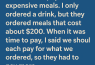 Over the years, this added up. I ignored it because I didn’t want to ruin the vibe. But last weekend, I’d had enough. I wasn’t even hungry and ordered just a drink—less than $10 total. Meanwhile, Susan and Greg ordered appetizers, full entrées, wine, and dessert. Their combined total easily hit $200.
