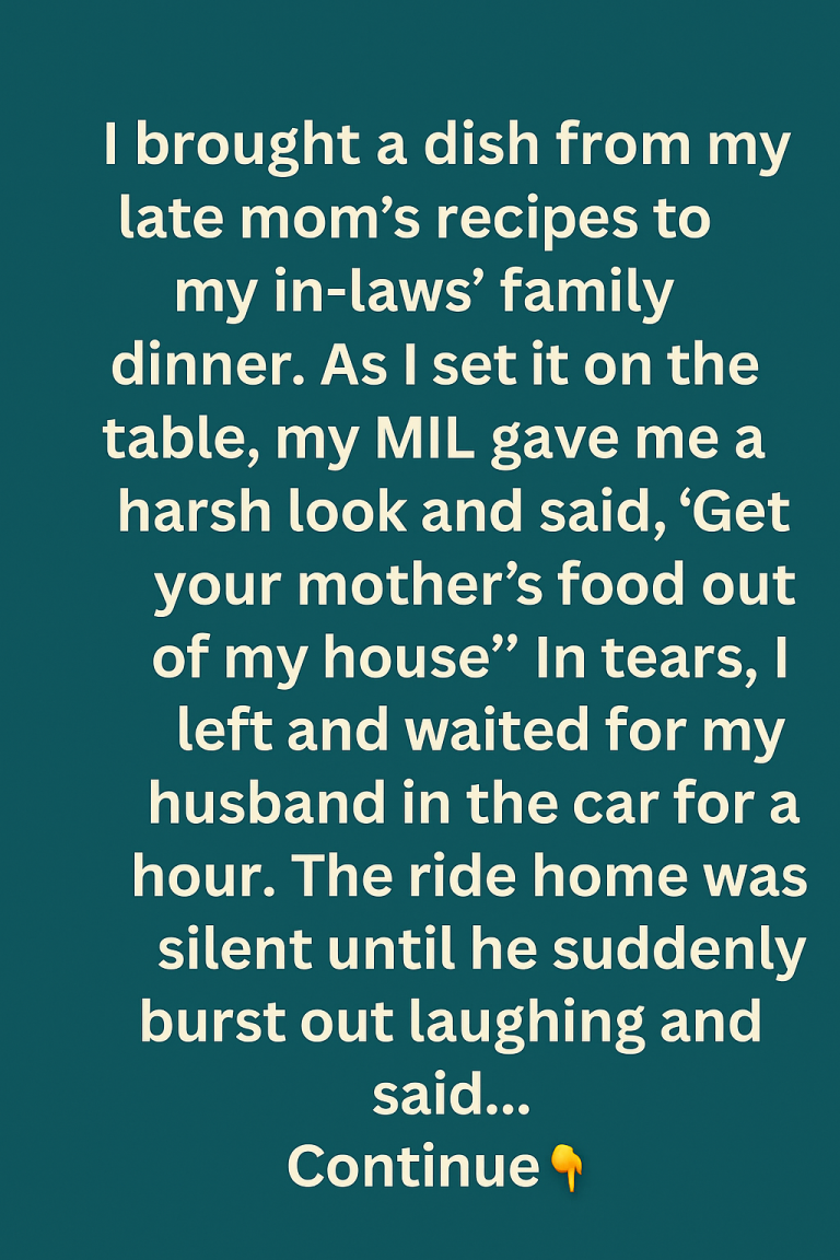 My hands trembled as I quietly lifted the dish, walked outside, and sat alone in the car. My mother’s old index card—the one with her smudged handwriting and flour stains—felt suddenly fragile in my mind. Bringing that recipe had felt like bringing her into the room with me.