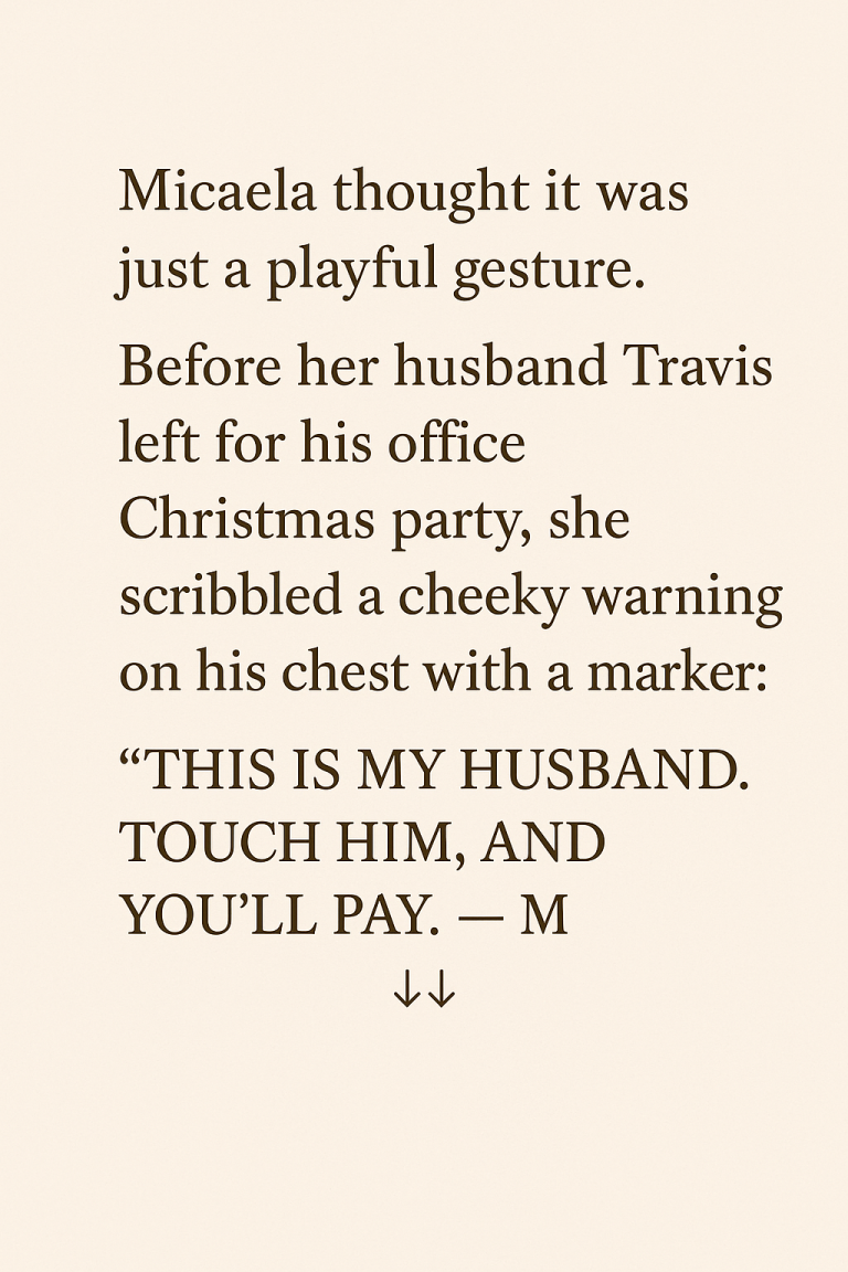 Micaela thought it was nothing more than a playful gesture—one of those silly, intimate moments couples laugh about for years. Before her husband Travis left for his office Christmas party, she uncapped a marker, grinned, and scribbled a cheeky warning across his chest: