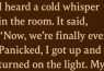 Around 3 a.m., I awoke to a cold whisper slicing through the silence.