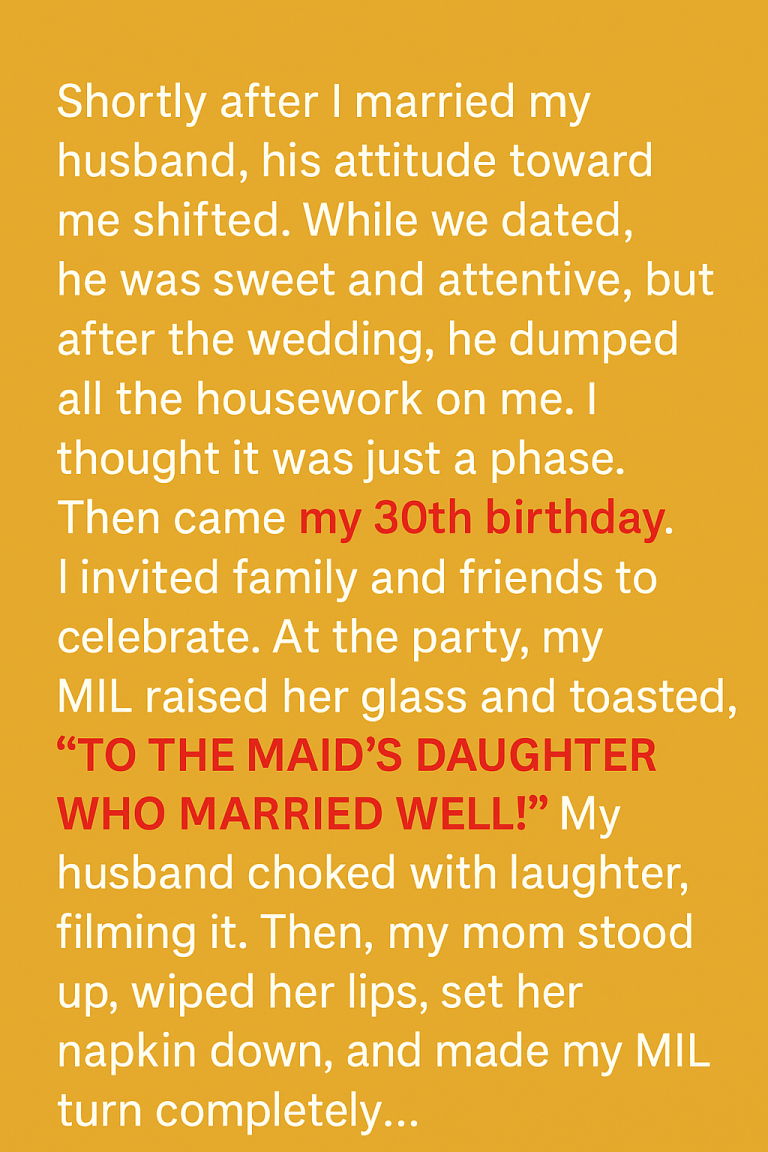 We hosted a small party. Just as I raised my glass to thank everyone, Patricia clinked hers louder and announced with a smug grin, “To Sarah, the maid’s daughter who married well.”
