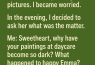Me: “Sweetheart, why have your paintings at daycare become so dark? What happened to happy Emma?”