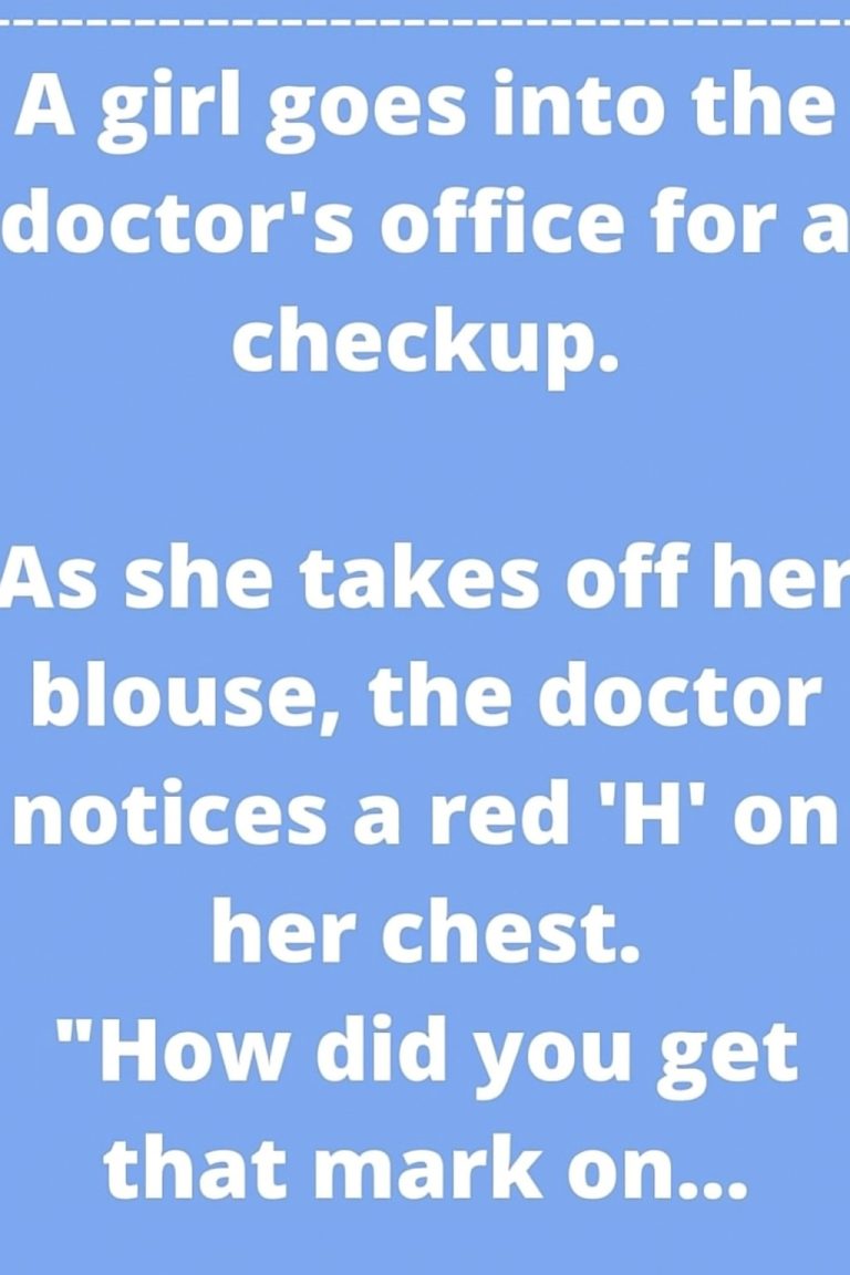 A young woman visits the doctor for a routine checkup. As she unbuttons her blouse, the doctor notices a faint red “H” imprinted on her chest.