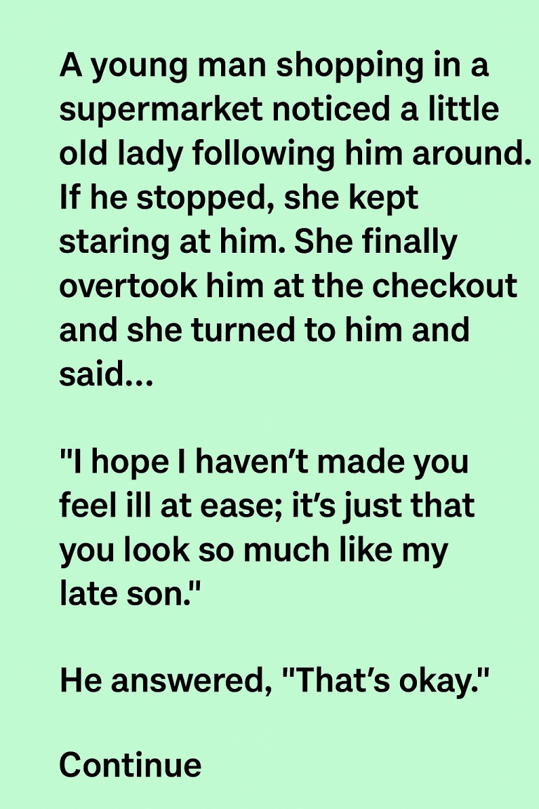 While walking through the grocery store one quiet afternoon, a young man began to notice something odd—a frail elderly woman seemed to be quietly shadowing him. She never came too close, yet wherever he went, she lingered just a few steps behind. If he stopped to examine an item, she would pause nearby. If he reached for something, she’d mimic the motion, though her hand always landed on a different product.