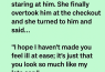 When they finally reached the checkout line—him with a basket of basics, her with a small cart of things clearly chosen with care—she slowly approached him. Her eyes were misty, but warm in a way that pierced right through his discomfort.