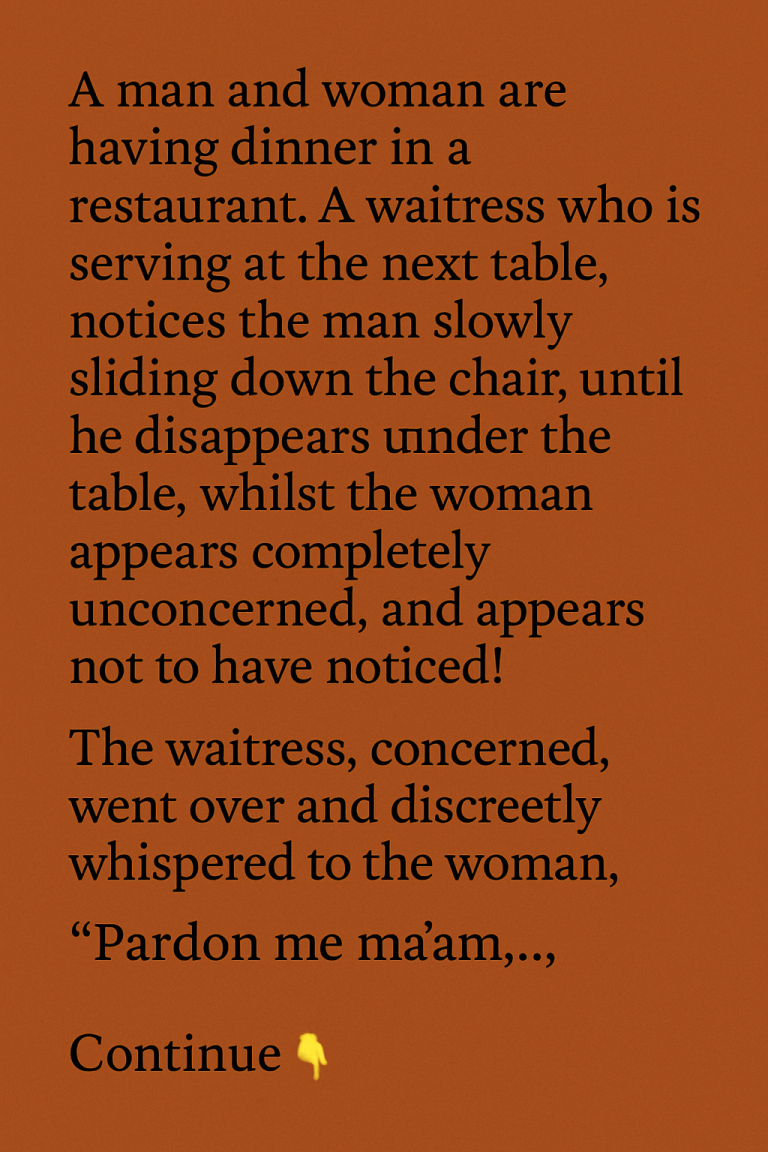 Concerned, the waitress walked over and whispered politely, “Excuse me, madam, but I think your husband just slipped beneath the table.”
