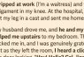 At work, I tripped carrying four iced teas and a sizzling plate of eggplant parm. Fell hard. The pain was instant and intense.