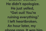 He didn’t apologize. Instead, he yelled, “Get out! You’re ruining everything.” I left, tears blinding me. An hour later, he called. “I had to yell,” he said. “She’s my boss. I couldn’t risk it.”